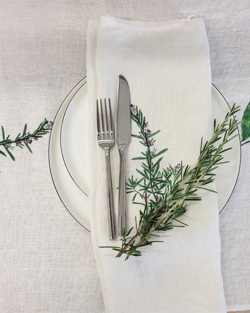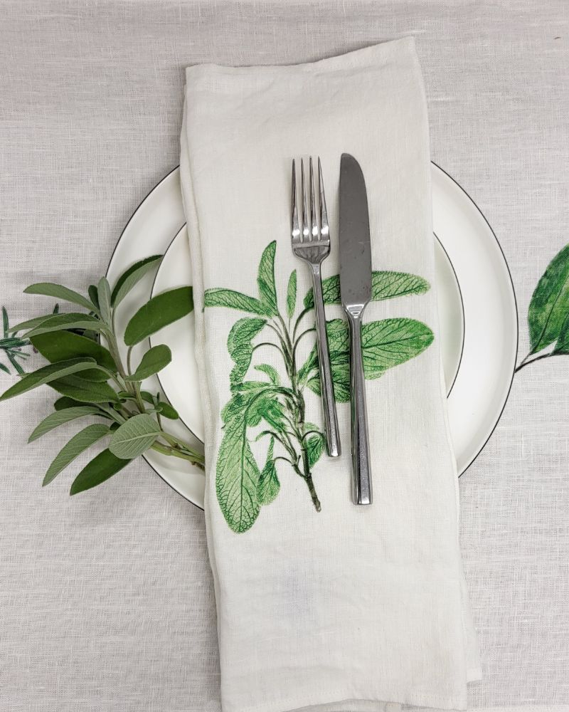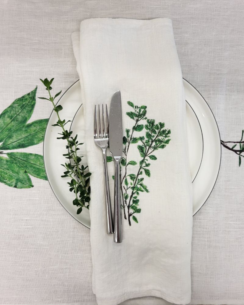 This set includes four individually designed napkins, each featuring a different herb from the garden: Rosemary, Bay Leaf, Mint, and Sage. Inspired by the botanical motifs found on the matching runner, each napkin showcases one herb in delicate detail, bringing a touch of nature to your table setting.