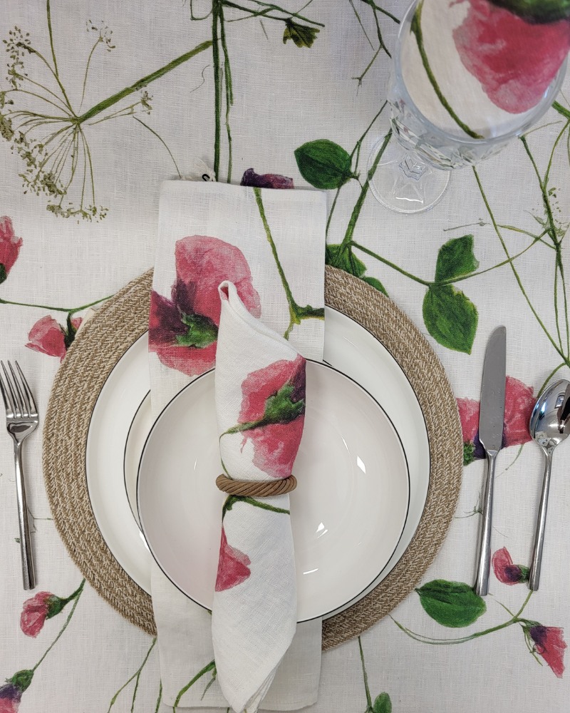 Nicola’s Wild Sweet Pea linen collection features intricately designed table runners, crafted from 100% Organic Irish Linen. Each piece showcases her expressive artistry, capturing the beauty of Wild Sweet Pea in a unique and captivating manner. With deep textures reminiscent of the natural world, these table runners bring a touch of botanical elegance to any dining or living space.